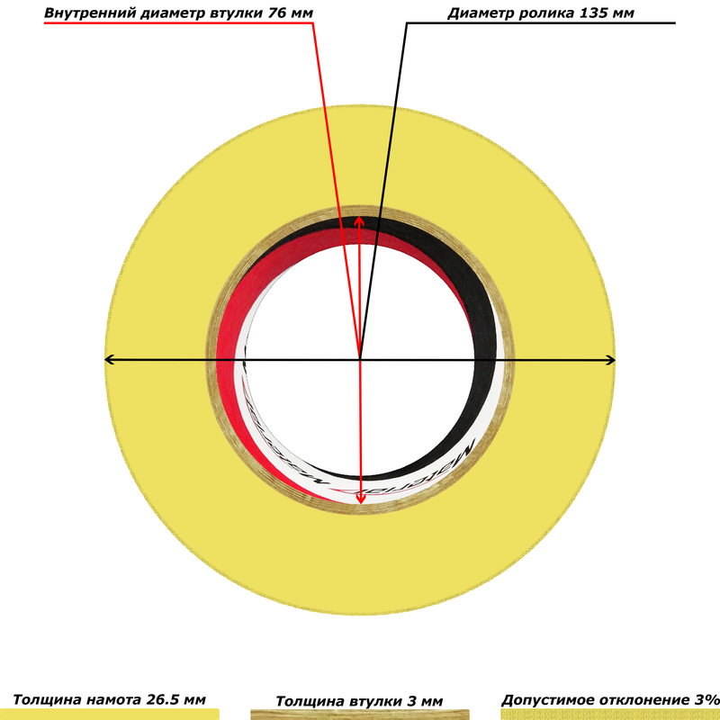 Для более точного расчёта длины намота, при помощи веса ролика, рекомендуем пользоваться следующей формулой: от веса брутто вычитаем 23 гр (самый распространенный вес втулки), а остаток делим на 1.95 (константа для 1-го метра скотча при толщине 45 мкм и ширине 45 мм). Полученное число и будет являться настоящей длиной клейкой ленты. Рассмотрим на примере скотча 200 м / 45 мм / 45 мкм - (413 гр – 23 гр) / 1.95 = 200 м. Но также, нужно учитывать, что из-за разнотолщинности клейкой ленты, по весу и толщине слоя намота, допустимы отклонения параметров в 3%.