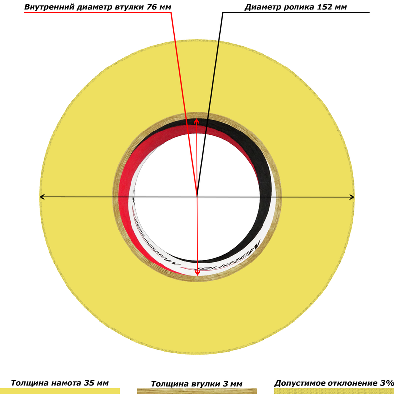 Для более точного расчёта длины намота, при помощи веса ролика, рекомендуем пользоваться следующей формулой: от веса брутто вычитаем 23 гр (самый распространенный вес втулки), а остаток делим на 1.65 (константа для 1-го метра скотча при толщине 38 мкм и ширине 45 мм). Полученное число и будет являться настоящей длиной клейкой ленты. Рассмотрим на примере скотча 280 м / 45 мм / 38 мкм - (485 гр – 23 гр) / 1.65 = 280 м. Но также, нужно учитывать, что из-за разнотолщинности клейкой ленты, по весу и толщине слоя намота, допустимы отклонения параметров в 3%.